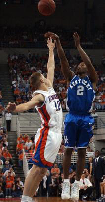 Trailing 41-37 midway through the second half, UK's dominating defense forced Florida into a turnover on five straight possessions. Kentucky, however, managed just one basket during that near five-minute stretch, a 12-foot jumper by Morris of an offensive rebound, and continued to trail by the time Florida finally scored again. On the other possessions, Chuck Hayes missed a wide open look down low, Rajon Rondo misfired when forcing a shot in the lane, Hayes made a huge steal but had the shot blocked by Matt Walsh on his way to a dunk and Rondo missed another short jumper.