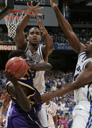 Ramel Bradley (#3) shoots against "Baby Shaq" Glen Davis
