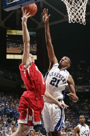UK (1-0) survived because of a superior defensive effort sparked by freshman Perry Stevenson's seven blocked shots. Clinging to a one-point lead the Cats held Miami scoreless over the final 4:49, closing the game on a 10-0 run that masked what was a much tighter contest. The Red Hawks converted just one field goal in the game's final 9:52 after Tyler Dierkers scored on a lay-up to cut the UK lead to 43-41.