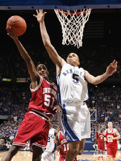 Never was the Cats' renewed faith in their defense more critical than in the closing minutes. Indiana closed within 52-50 on a tip-in of a missed free throw by D.J. White with 4:16 remaining but managed just one field goal -- a Joey Shaw lay-in off a steal - on eight shots the rest of the game. Four of those attempts came on a possession that began when Indiana's Earl Calloway stripped Derrick Jasper clean and had what appeared to be a wide-open lay-up that would have cut the lead to 57-56 but saw Jasper rush back down the floor and block Calloway's lay-up attempt. On the ensuing inbounds UK forced two misses in the lane by Shaw and an errant three-pointer by Roderick Wilmont, the final shot being corralled by UK's Sheray Thomas, who had entered just seconds before when Perry was bloodied in a collision with Shaw.