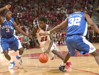 Patrick Beverley (#21) drives against UK's Ramel Bradley (#3) and Joe Crawford (#32)