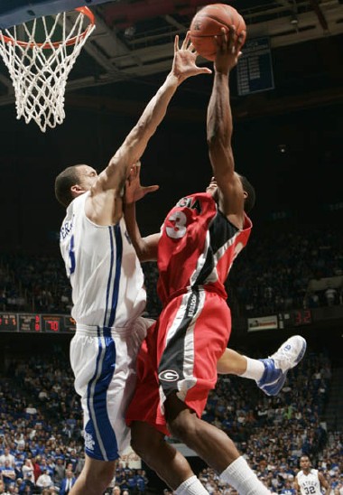 Sheray Thomas (#23) and Randolph Morris (#33) defend the basket against Georgia's Sundiata Gaines
