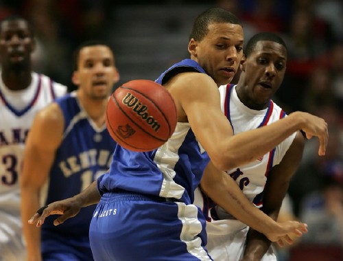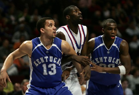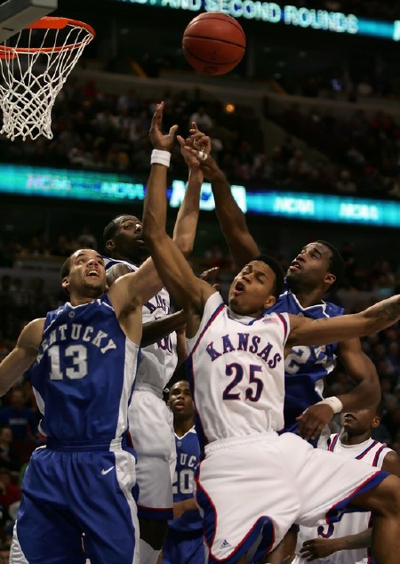 Bobby Perry (#13) and Jodie Meeks (#20) try to keep KU's Julian Wright out of the lane