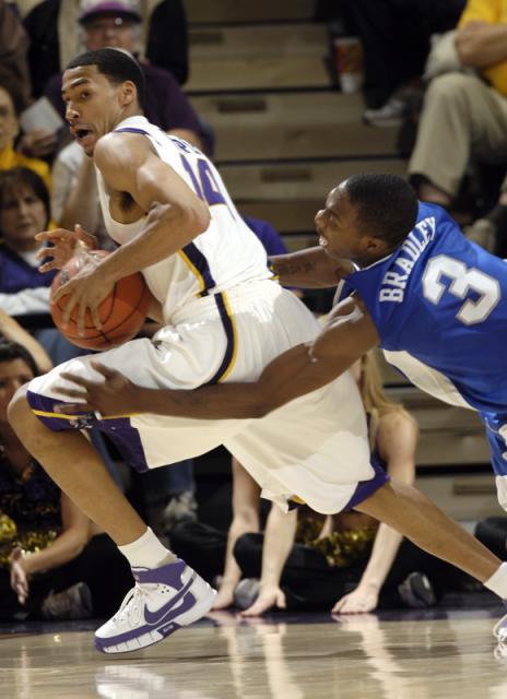 Ramel Bradley (#3) fouls LSU's Garrett Temple after losing the ball