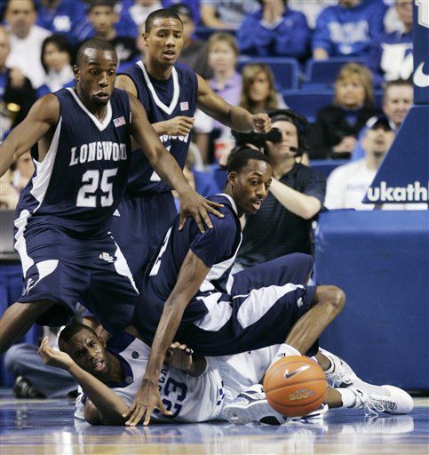 Jodie Meeks can only look as three Longwood defenders converge on the loose ball