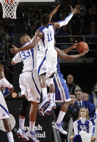 Wall and Cousins took center stage as the lead swelled with every passing minute in the second half. Darnell Dodson began the Cats' most potent onslaught with a baseline drive before sandwiching a runout around a three-point play by Cousins. That's when the real fun began, as Wall delivered alley-oop passes on three consecutive possessions, then added a fourth seconds after Cousins finished another nifty Wall pass with a dunk. By that point Wall had 12 dimes, well on his way to the UK freshman record he set on the night.