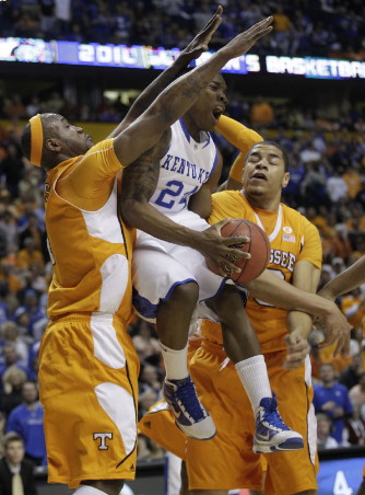 Eric Bledsoe slices between Tennessee's Wayne Chism and Brian Williams