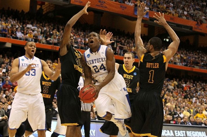 Eric Bledsoe (#24) dips underneath the West Virginia defense as Daniel Orton (#33) looks on