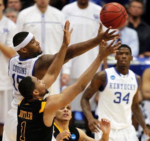 DeMarcus Cousins (#15) reaches for the ball in front of WVU's Da'Sean Butler (#1)
