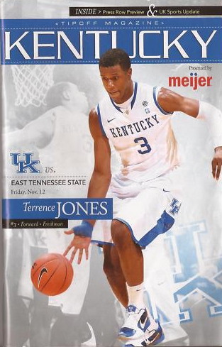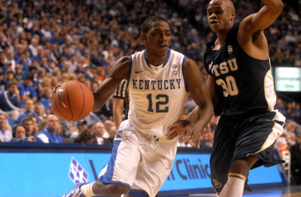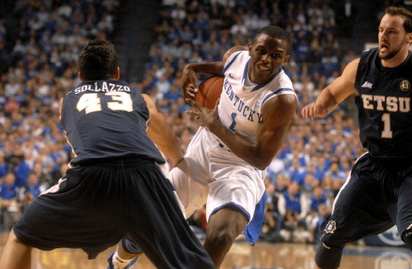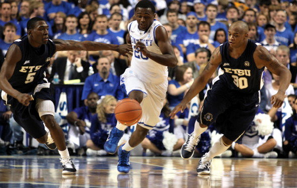 Kentucky's Doron Lamb tracks the ball down with ETSU's Sheldon Cooley (#5) and Micah Williams (#30) also in pursuit