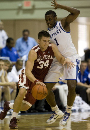 Oklahoma's Cade Davis (#34) drives against the pressure of Kentucky's Darius Miller (#1)