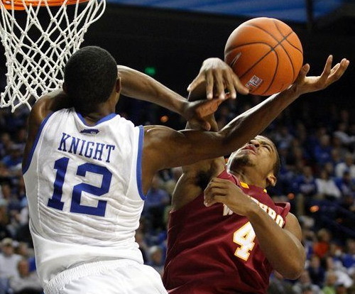 Brandon Knight (#12) attacks the basket but is rejected by Winthrop's Reggie Middleton