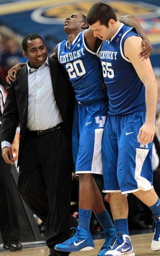 UK Trainer Chris Simmons and Josh Harrellson (#55) help Doron Lamb (#20) off the court after Lamb injured his ankle