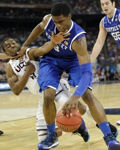 Terrence Jones (#3) fends off UCONN's Kemba Walker for the ball