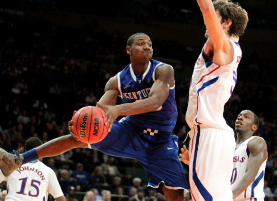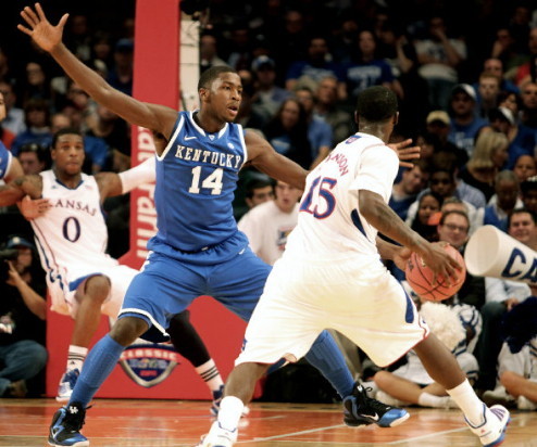 Terrence Jones (#3) and Marquis Teague (#25) defend against Kansas point guard Tyshawn Taylor