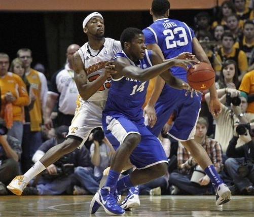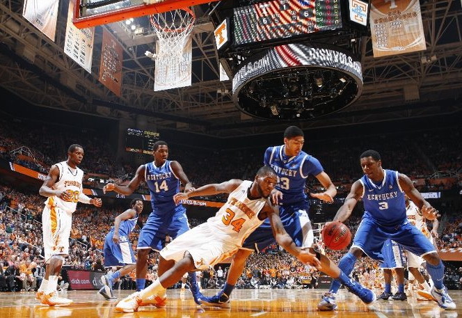 Terrence Jones (#3) grabs the ball away from Tennessee's Jeronne Maymon (#34) while Michael Kidd-Gilchrist (#14), Anthony Davis (#23) and Kenny Hall (#20) look on.