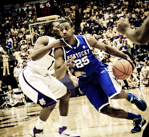 Darius Miller (#1) shoots over LSU's John Isaac (#32)