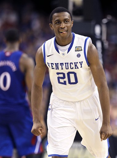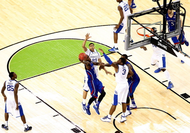 Anthony Davis (#23) and Terrence Jones (#3) defend against Tyshawn Taylor's drive while Marquis Teague (#25) looks on