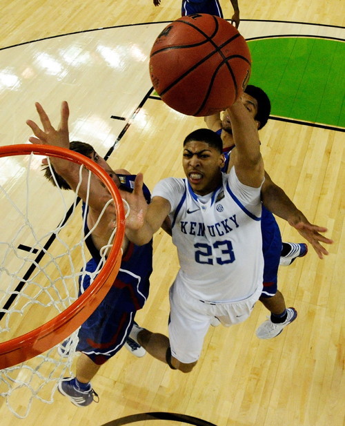 Anthony Davis (#23) fights inside against Jeff Withey and Kevin Young