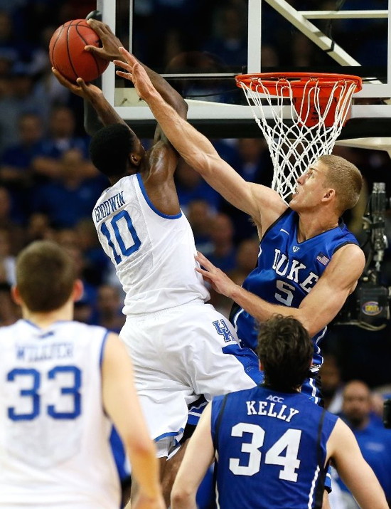 Alex Poythress (#22) attacks as the basket guarded by Duke's Mason Plumlee (#5)