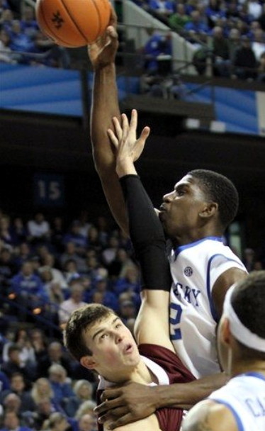 Archie Goodwin (#10) dunks in front of Lafeyette's Seth Hinrichs (#12)