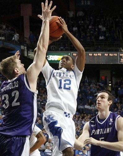 Ryan Harrow (#12) shoots in traffic between Portland's Ryan Nicholas (#32) and John Bailey
