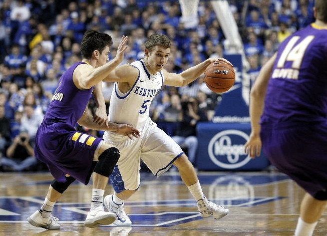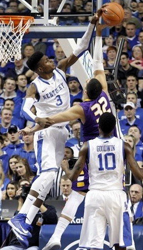 Nerlens Noel (#3) blocks the shot of Lipscomb's Oscar Garcia (#32) while Archie Goodwin (#10) looks on
