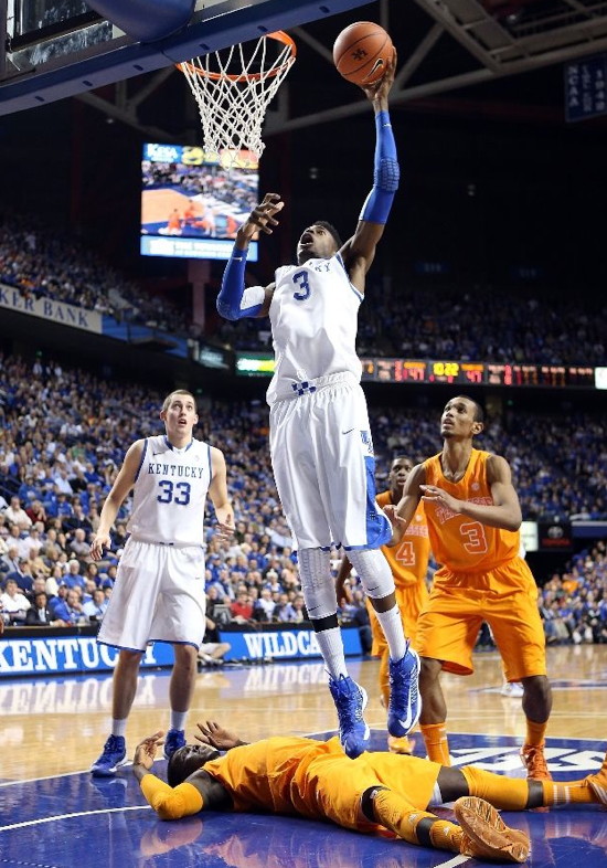 UT's Yemi Makanjuola can only watch from the floor as Nerlens Noel (#3) dunks overtop. UK's Kyle Wilter (#33) and UT's Derek Reese (#3) and Armani Moore (#4) are also seen.