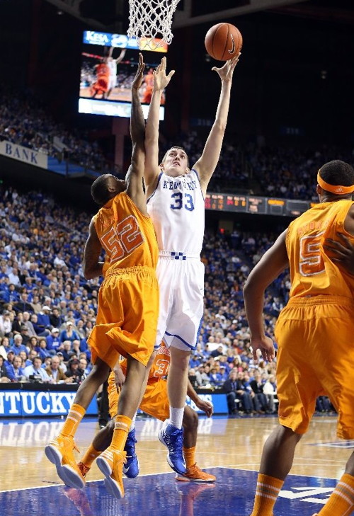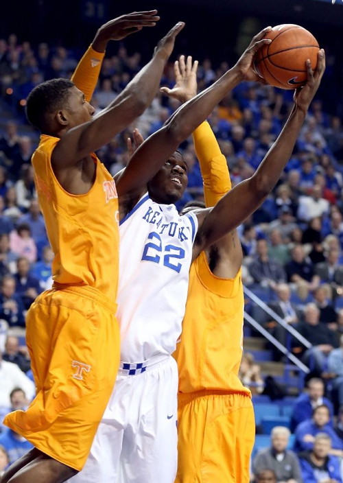 Alex Poythress (#22) splits two Vol defenders on the way to the basket