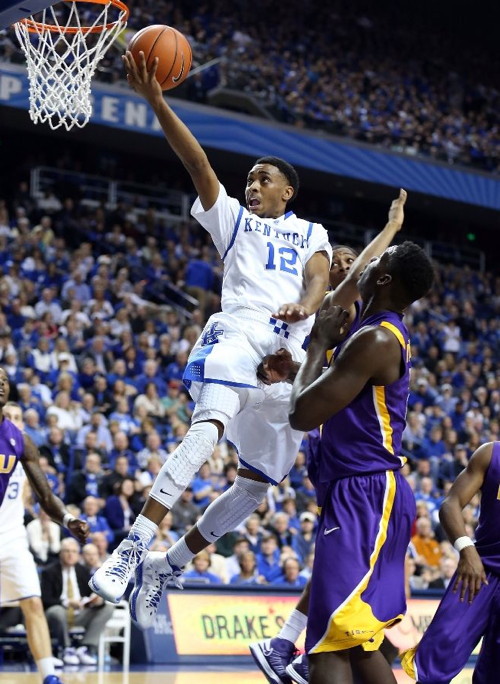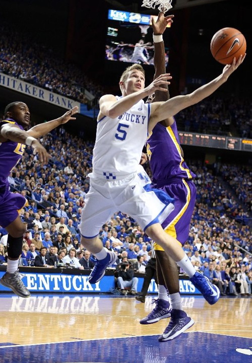 Jarrod Polson (#5) cuts through the LSU defense with a reverse lay-in