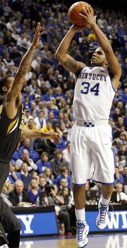 Archie Goodwin (#10) drives between Missouri's Alex Oriakhi (#42) and Keion Bell (#5)