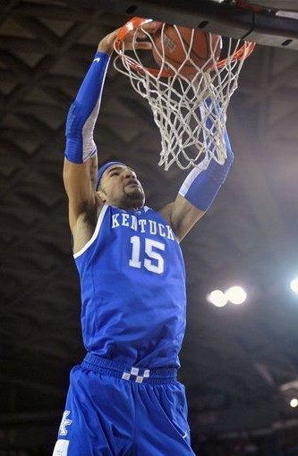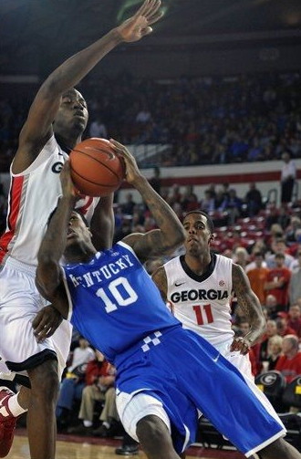 Archie Goodwin (#10) loses his footing as he drives against Georgia's John Florveus