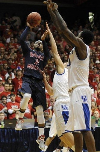 Willie Cauley-Stein (#15) gets thrown around by RMU's Velton Jones (#2)