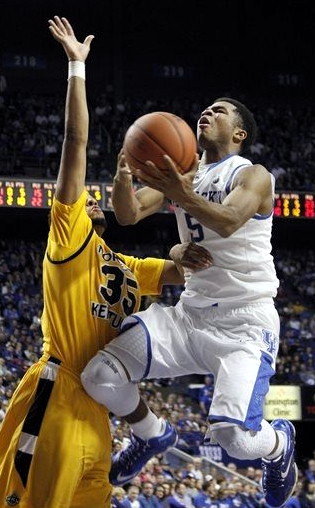 Andrew Harrison (#5) drives while defended by NKU's Deontae Cole (#35)