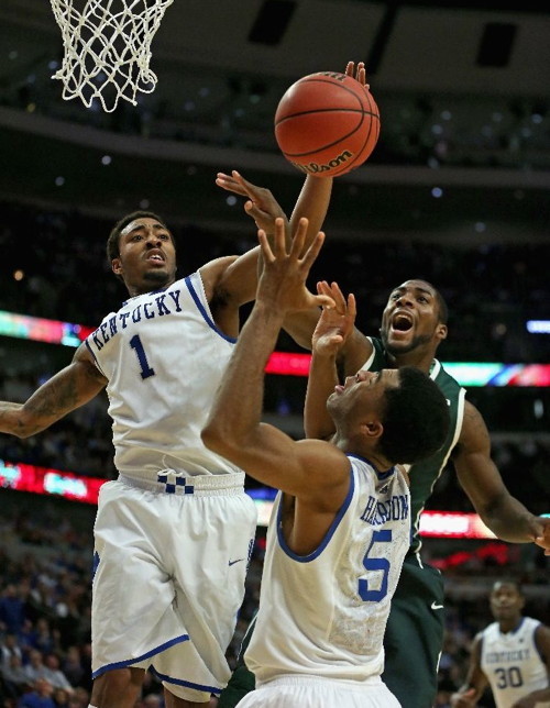 James Young (#1) and Andrew Harrison (#5) battles Michigan State's Branden Dawson for the ball