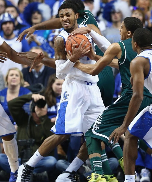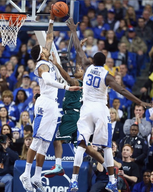 Willie Cauley-Stein blocks the shot of Raven Lee (#0) while Julius Randle (#30) assists