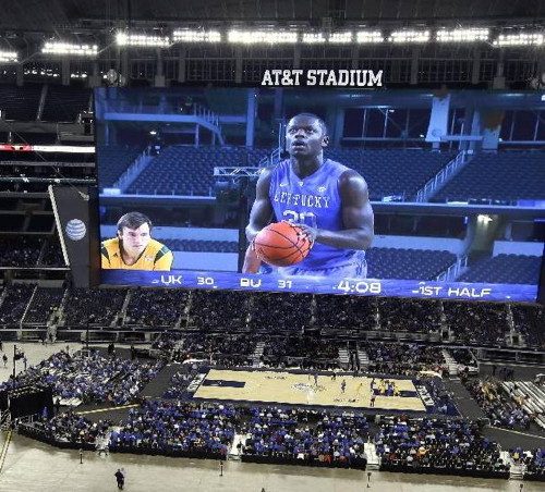 Julius Randle shoots a free throw on the big screen of Cowboys Stadium