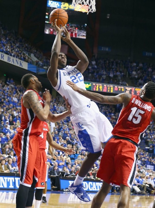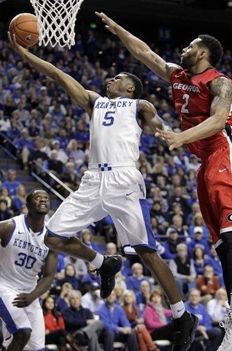 Kentucky's Andrew Harrison (#5) stretches ahead of Georgia's Marcus Thornton (#2)