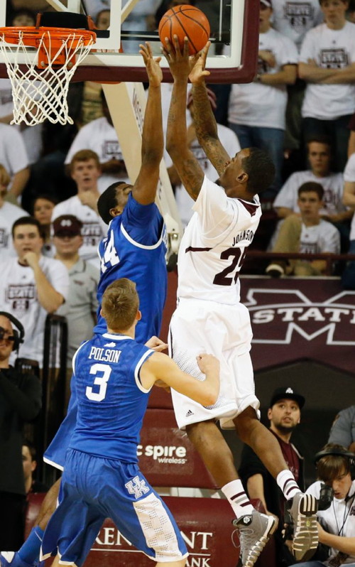 Mississippi State's Roquez Johnson (#25) shoots over Dakari Johnson (#44) while Jarrod Polson (#3) looks on