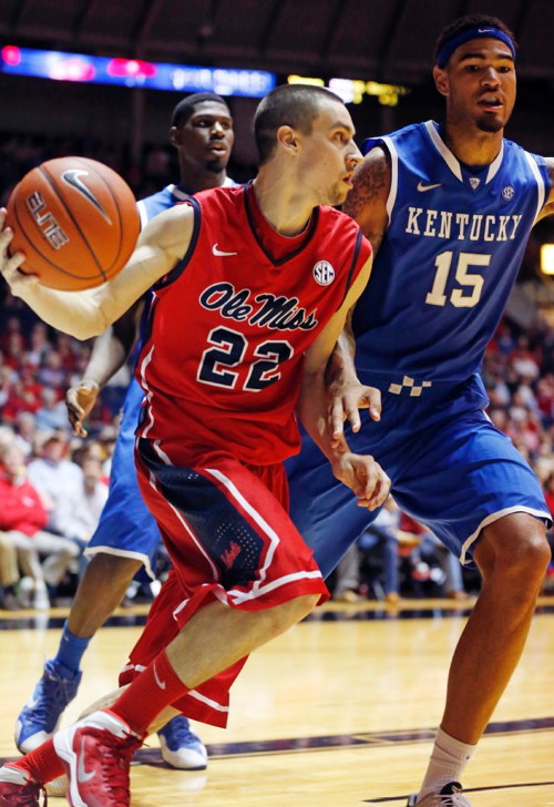 Ole Miss' Marshall Henderson (#22) looks to get around Willie Cauley-Stein (#15) while Alex Poythress looks on in the background