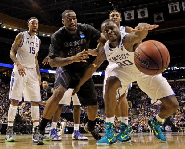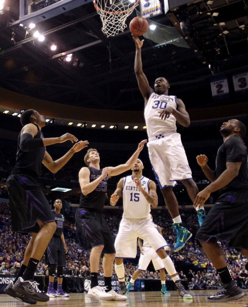 Julius Randle (#30) stretches for the ball while KSU's Thomas Gipson (#42) and UK's Willie Cauley-Stein (#15) and James Young look on