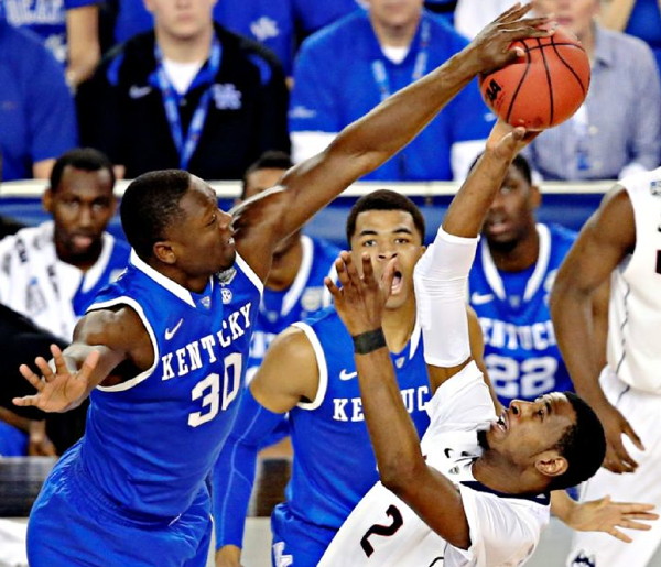 Julius Randle (#30) blocks the shot of UConn's DeAndre Daniels (#2)
