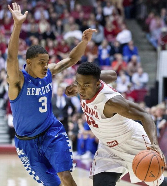 Tyler Ulis (#3) dogs Alabama's Retin Obasohan (#32) on defense