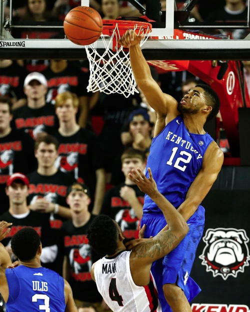 Aaron Harrison (#2) shoots a breakaway layup while fouled by Georgia's Kenny Gaines (#12)