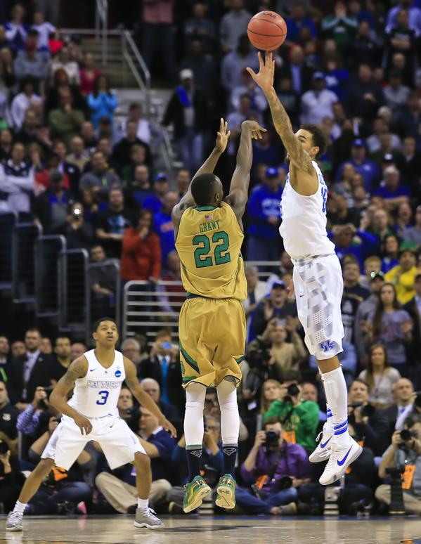 Willie Cauley-Stein blocks the shot of Notre Dame All-American Jerian Grant (#22)