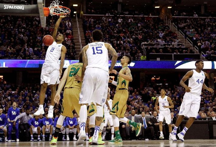 Aaron Harrison (#2) completes a key dunk late in the game