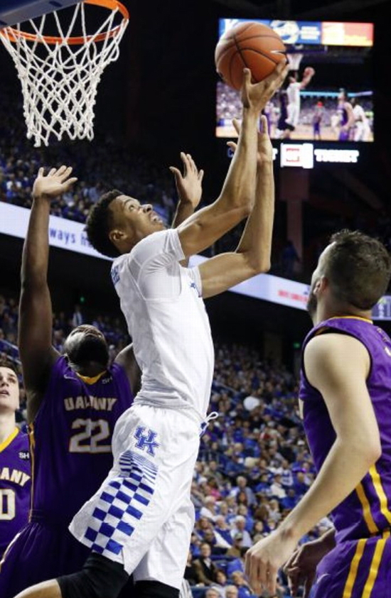 Skal Labissiere shoots between Albany's Richard Peters (#22) and Peter Hooley