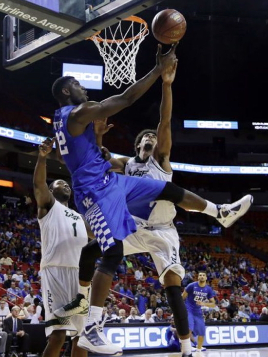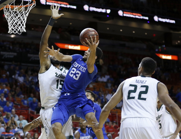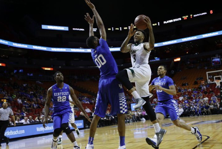 South Florida's Roddy Peters (#3) drives against Marcus Lee (#00) while Alex Poythress and Isaiah Briscoe look on