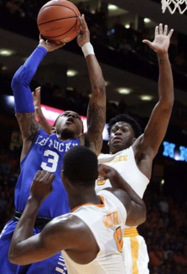 Tyler Ulis (#3) shoots between Admiral Schofield and Armani Moore (#4)