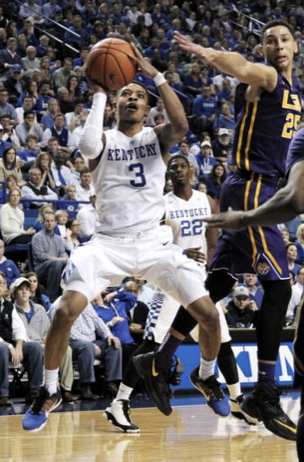 Senior Alex Poythress (#22) guards Freshman Ben Simmons of LSU